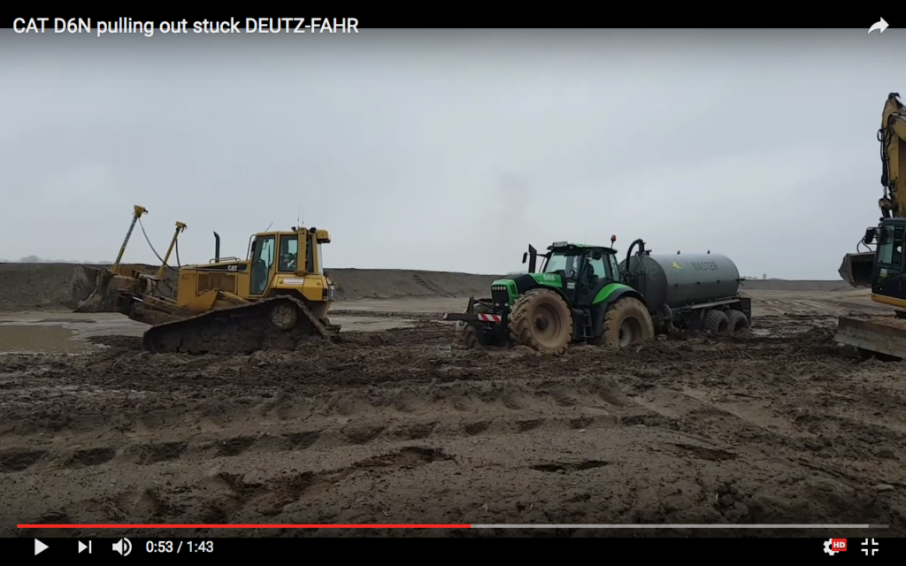 En Deutz-Fahr med tunna har fastnad på en byggarbetsplats. En Caterpillar D6N finns till hands men den får allt ta i för att fixa jobbet.