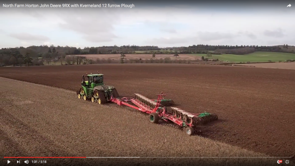 En John Deere 9RX plöjer med en 12-skärig Kverneland-plog. Filmen är från North Farm Horton i södra delarna av England. Detta ska vara det första exemplaret som såldes i Europa.